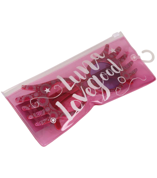 A pair of replica Spectrespecs, as worn by Luna Lovegood in Harry Potter and the Half-Blood Prince. These replica Spectrespecs are made of hard plastic, with a printed pattern across the frame. One lens is pink, and the other is blue. The Spectrespecs come in a protective plastic, zip-lock wallet which reads 'Luna Lovegood' on one side and 'Exceptionally Ordinary' on the reverse