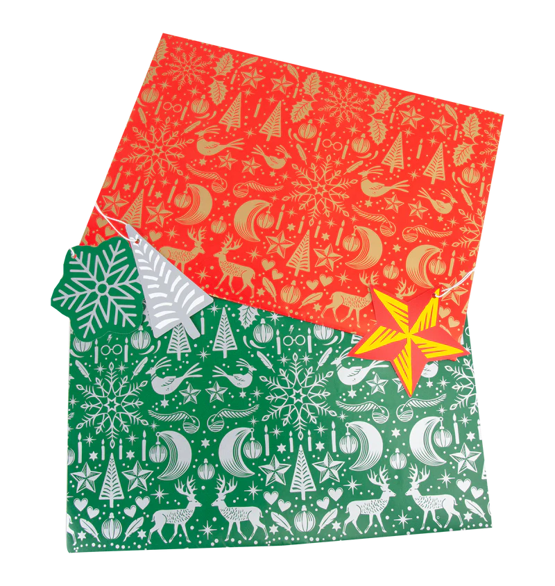 This Nordic Gift Wrap Pack includes all that is required to add some Wizarding World magic under the tree with two sheets of 594 mm x 841 mm (A1) wrapping paper. In a reflective metallic red and gold as well as forest green and silver, each sheet is reminiscent of the Hogwarts house colourways. Three sturdy card stock tags can also be found inside; a die cut snowflake, star and tree with attached string, measuring approximately 8-10cm.